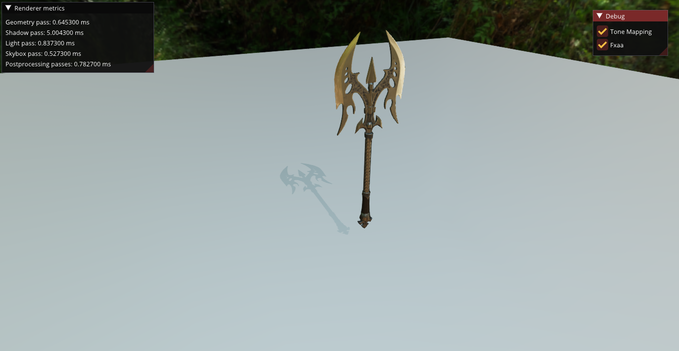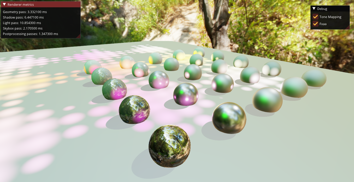 A rendering engine under-development for real-time applications such as games. It was designed to be easily integrated in any application. This project has been serving as a tool to learn all kinds of computer graphics techniques, to name a few: Physically Based Rendering, FXAA, Cascaded Shadow Mapping and more. It uses GLEW to import the OpenGL functions, ASSIMP to import meshes and STB to import and save image files.